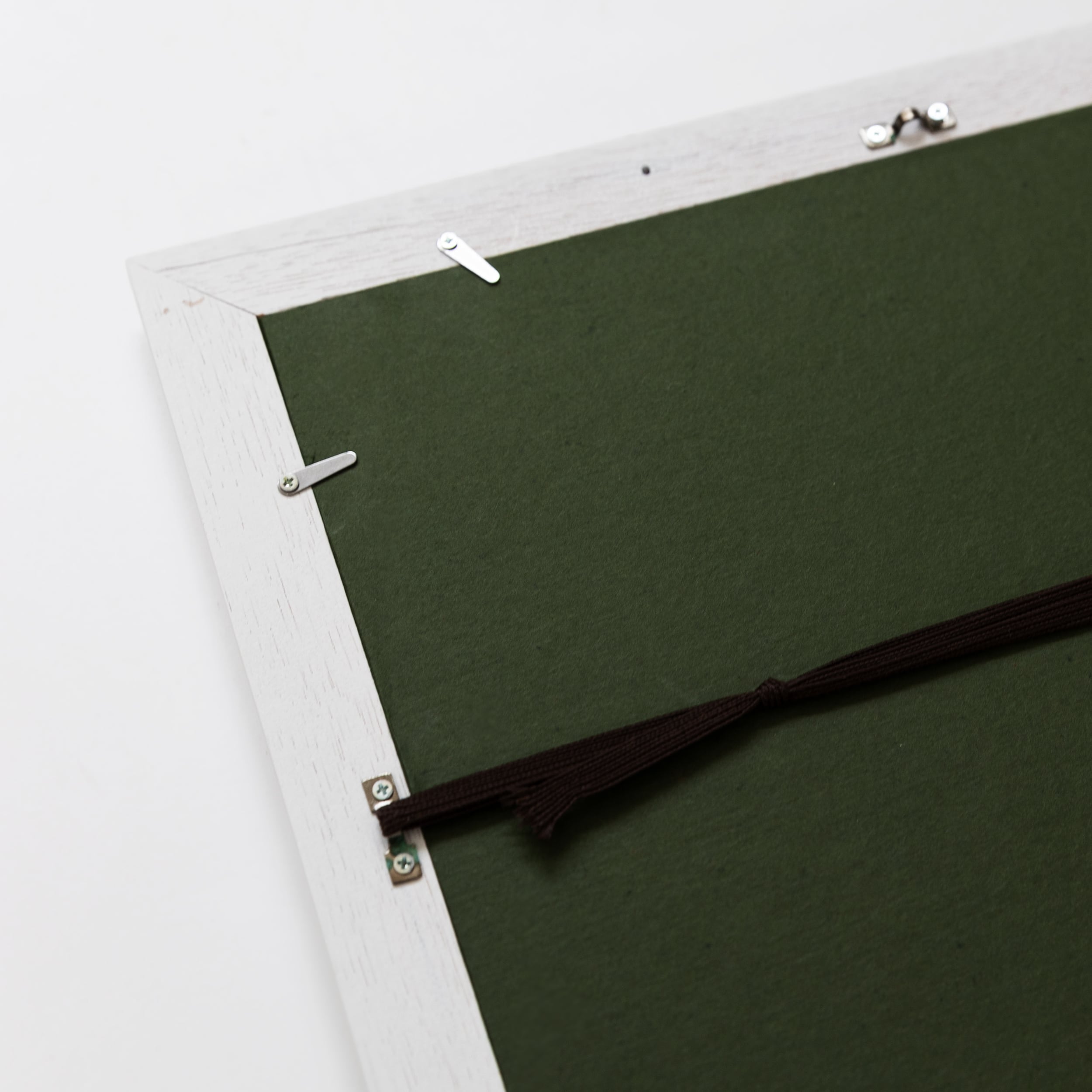 木額を白塗装したもので、このシリーズのために別注で製作したものです。紐で壁面にかけていただけます。釘や木ネジで固定してください。設置の際は、壁材によって適切な設置方法でお願いいたします。